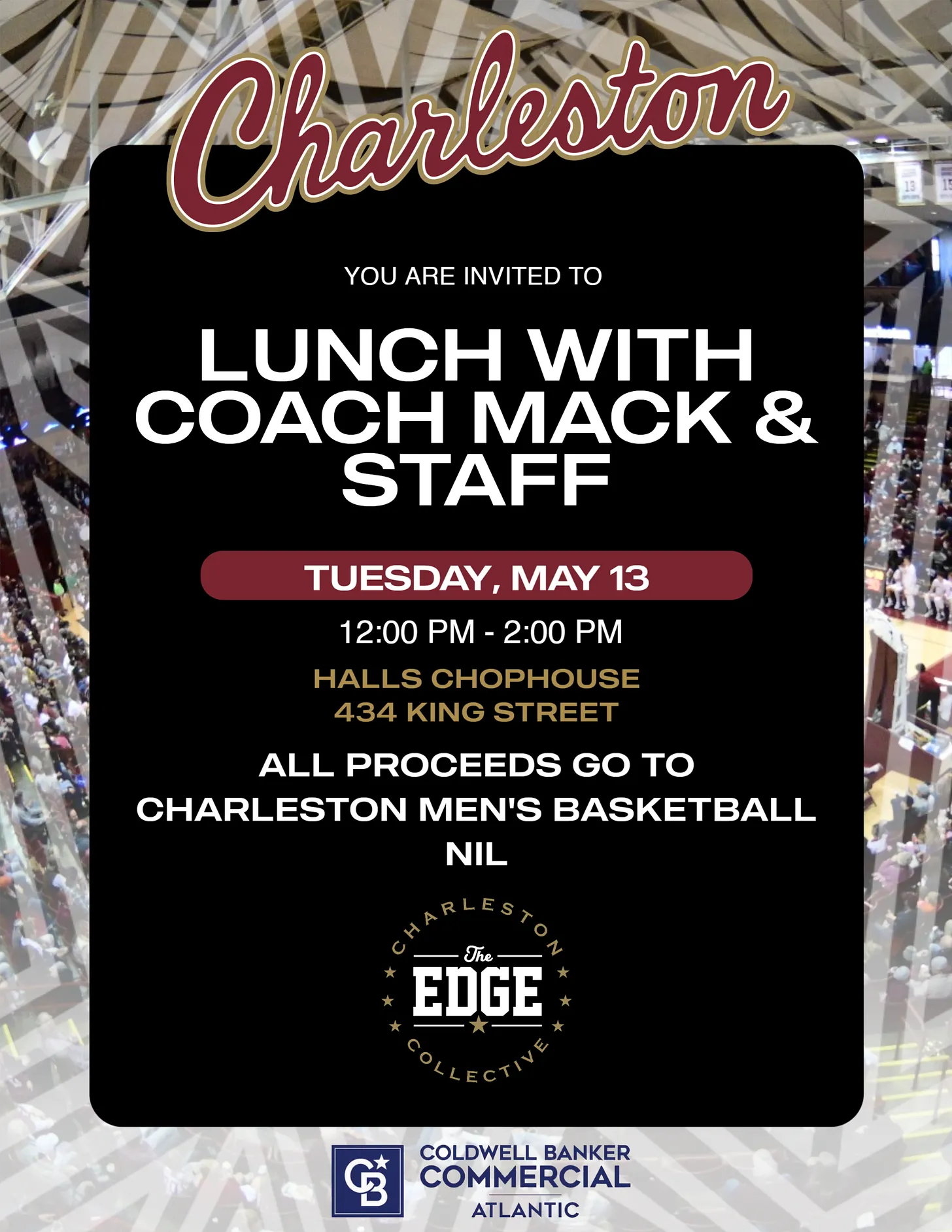 Join Charleston Men’s Basketball head coach Chris Mack and staff on Tuesday, May 13, from 12:00–2:00 PM at Hall’s Chophouse (434 King Street) for an intimate, first-class lunch experience in support of College of Charleston’s Men’s Basketball’s NIL efforts. Tickets are $500 per person.